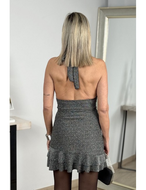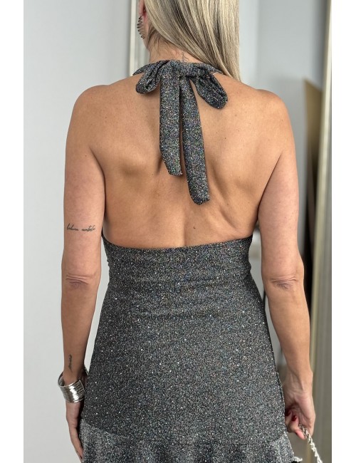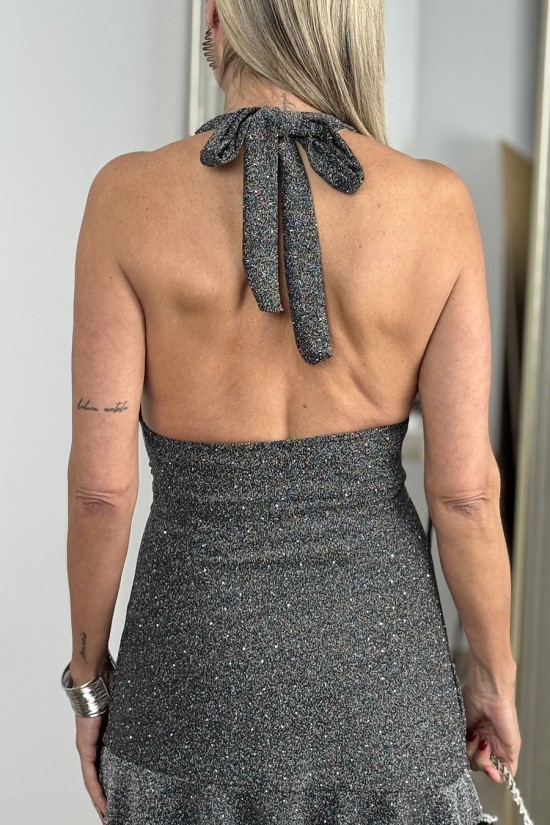 Short, stretchy dress made of shimmering lurex with mini sequins scattered throughout. Features an irregularly shaped metal buckle at the waist, a V-neckline, and ties at the back with two straps. Flared hem and open back.