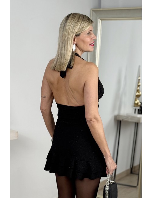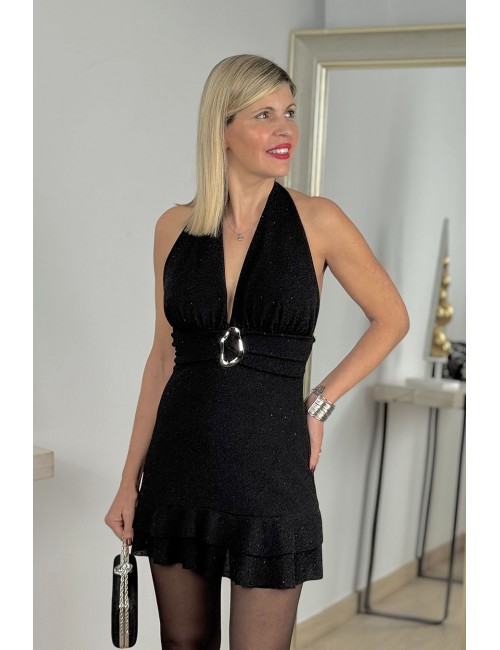 Short, stretchy dress made of shimmering lurex with mini sequins scattered throughout. Features an irregularly shaped metal buckle at the waist, a V-neckline, and ties at the back with two straps. Flared hem and open back.