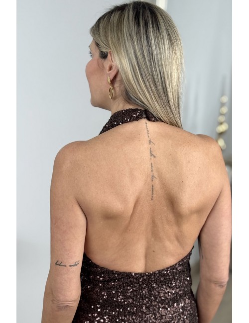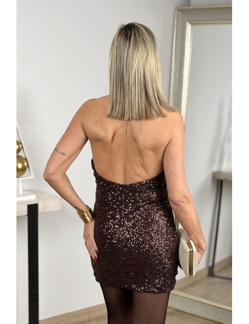 Short, sleeveless dress made from stretch sequined fabric. Slim fit with a fine knit lining. Features a cascading neckline and open back.