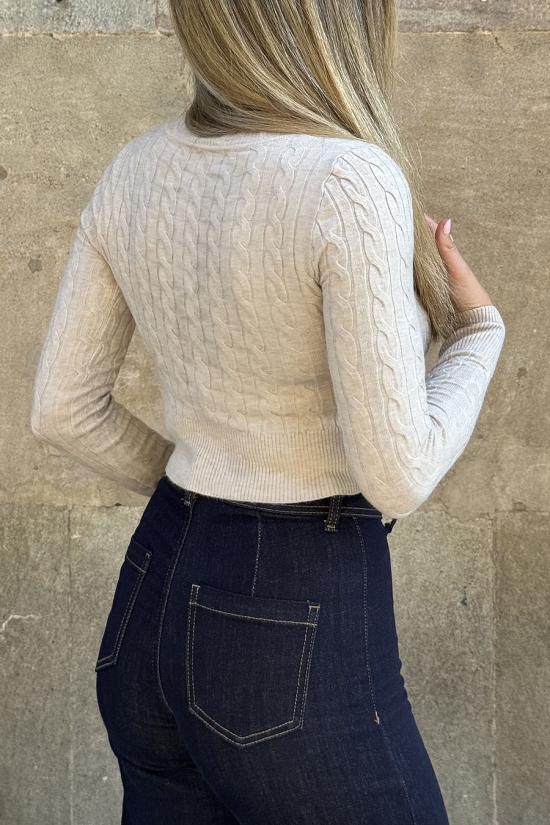 Short-sleeved jumper in cable knit with a V-neck. The hem, neckline and cuffs are in rib knit. A versatile wardrobe staple that will go with your skirts and trousers.