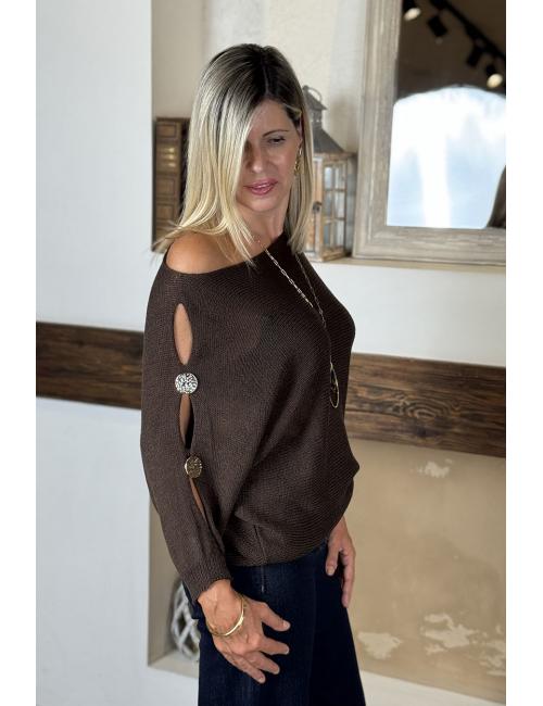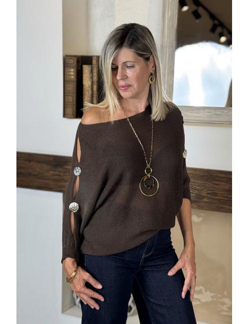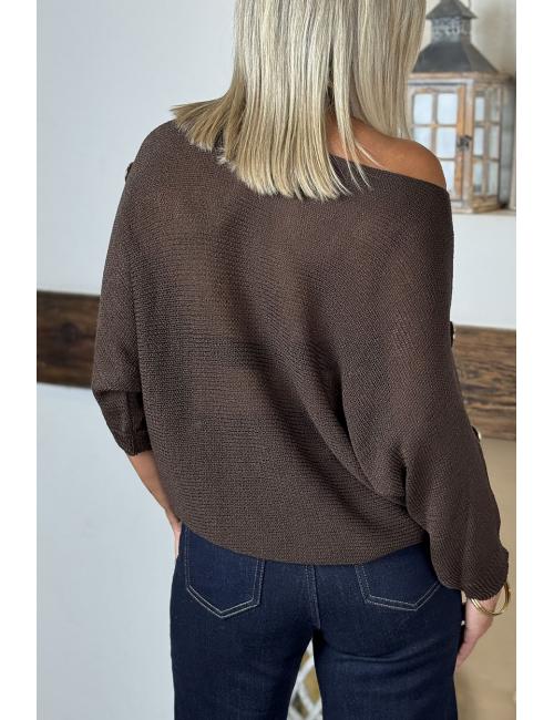 Long-sleeved batwing jumper with side slit and two textured gold buttons. Boat neck and ribbed cuffs.