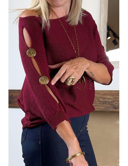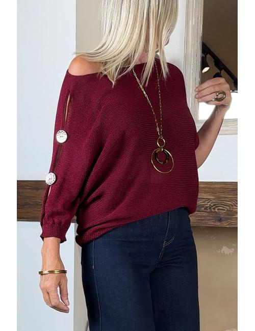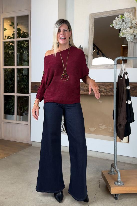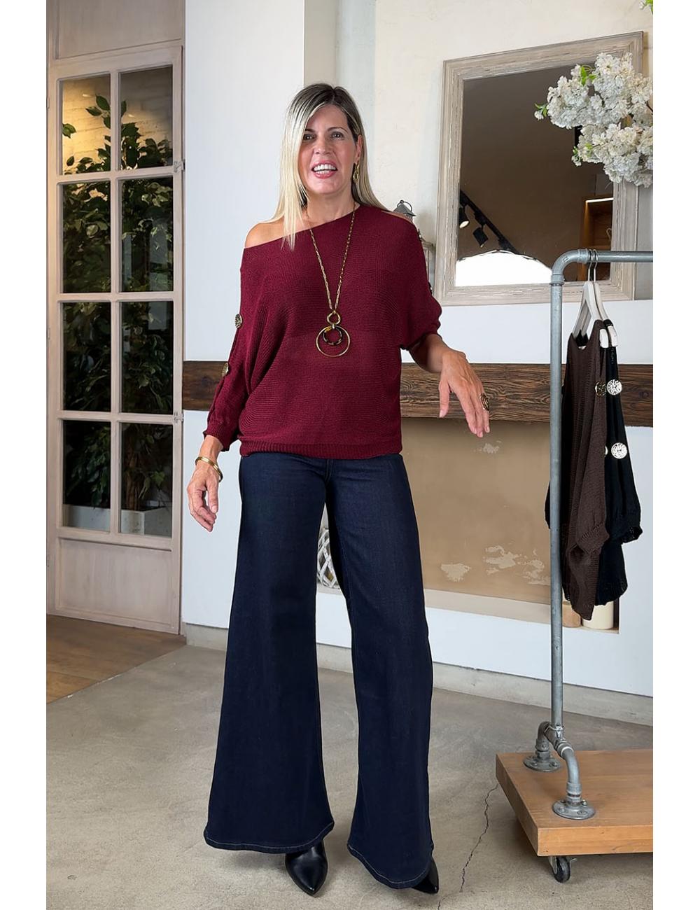 Long-sleeved batwing jumper with side slit and two textured gold buttons. Boat neck and ribbed cuffs.