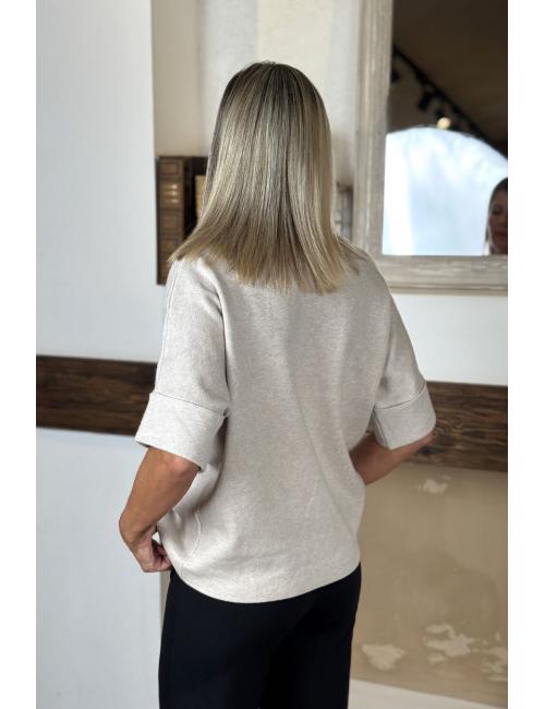 Perkins neck jumper, short sleeves with turn-ups and made from thick knit fabric. Front opening with two large mother-of-pearl buttons. Flowing oversized fit.