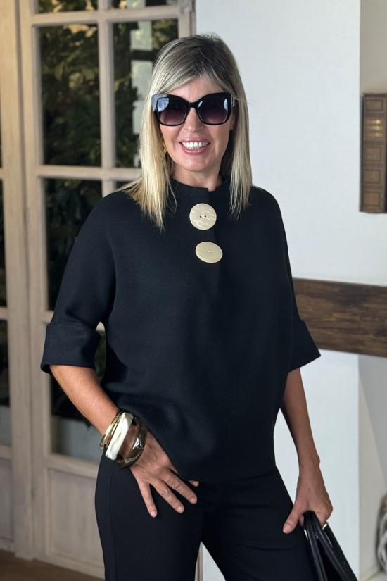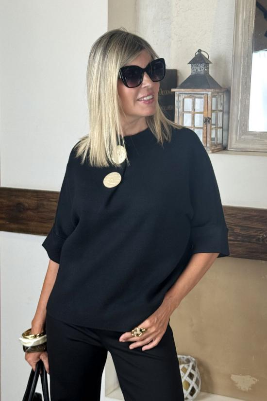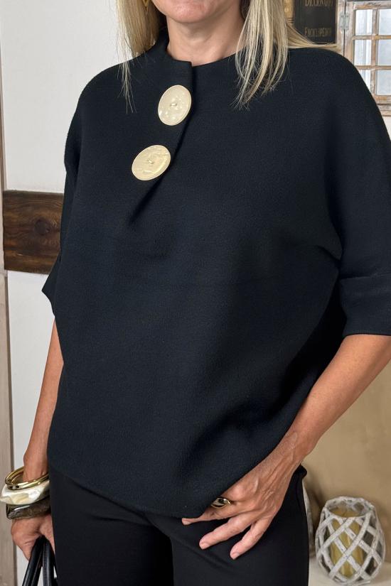 Perkins neck jumper, short sleeves with turn-ups and made from thick knit fabric. Front opening with two large mother-of-pearl buttons. Flowing oversized fit.