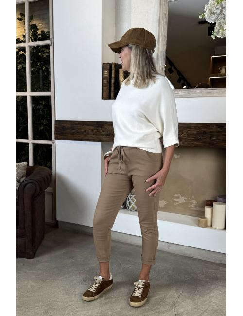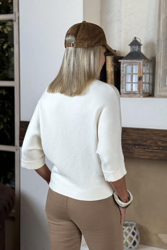 Basic sweater with Perkins collar, 3/4 sleeves with cuffs, and made from dense medium knit fabric. Flowing oversized fit.