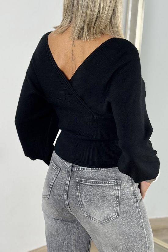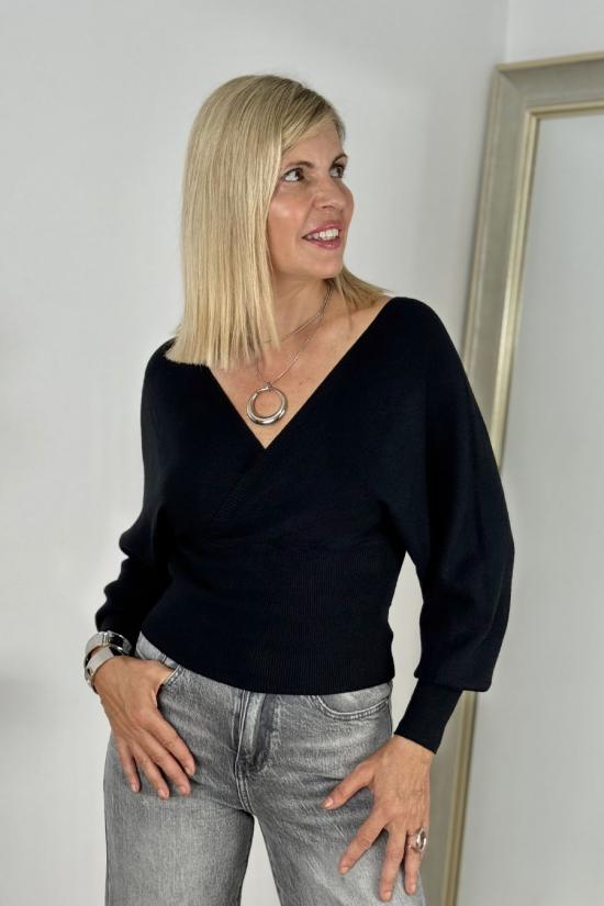 Crossover jumper at the front and back, made from fine stretch knit fabric. Slightly puffed long sleeves. V-neck at the front and back.