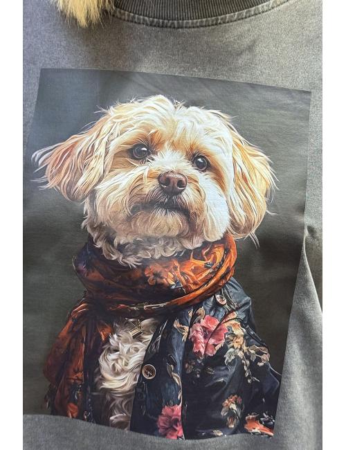 Oversized faded sweatshirt with a print on the front of a dog wearing a jacket with a floral pattern and a red and orange scarf. Dropped shoulders and round neck.