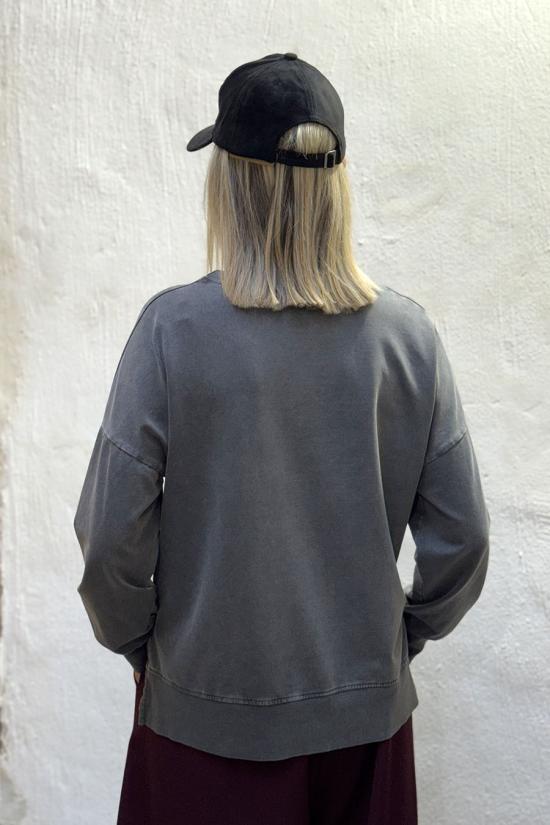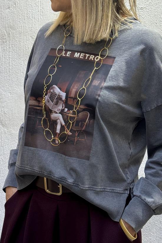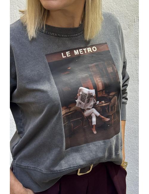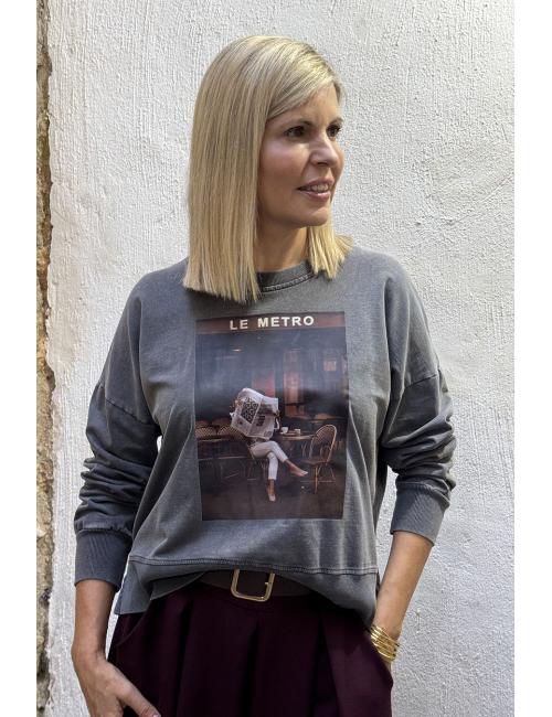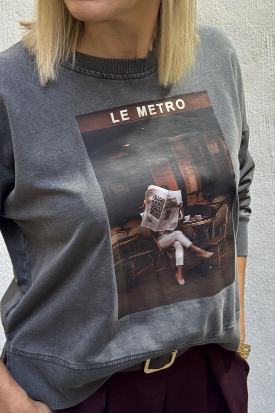 Oversized faded sweatshirt with print on the front, dropped shoulders and round neck. ‘Le Metro’ and a girl reading the newspaper while having a coffee in a classic Parisian bistro.