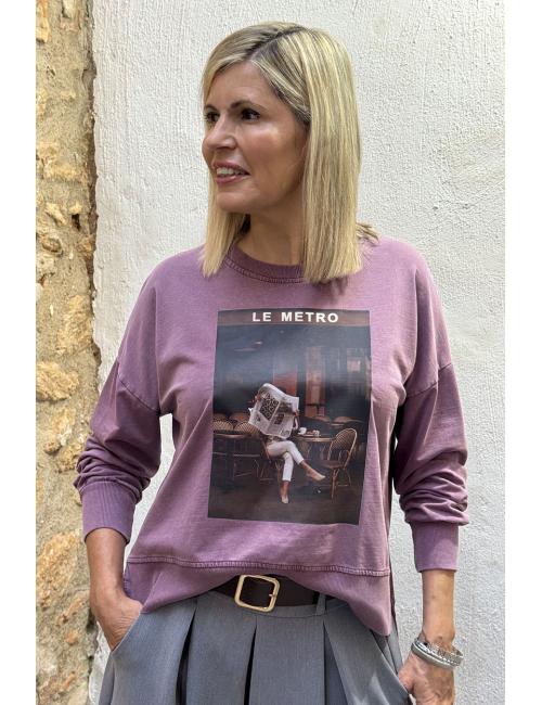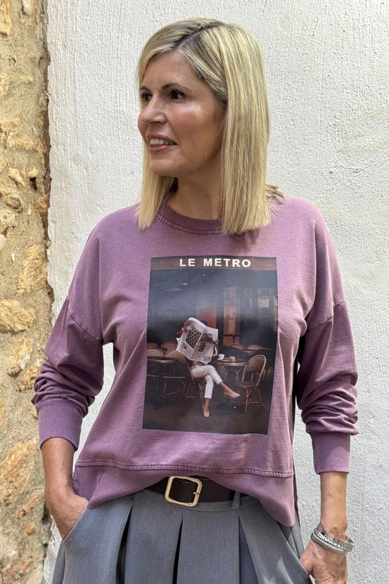 Oversized faded sweatshirt with print on the front, dropped shoulders and round neck. ‘Le Metro’ and a girl reading the newspaper while having a coffee in a classic Parisian bistro.