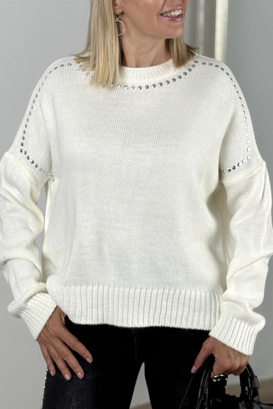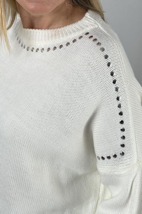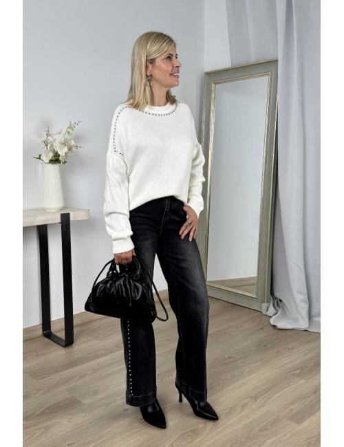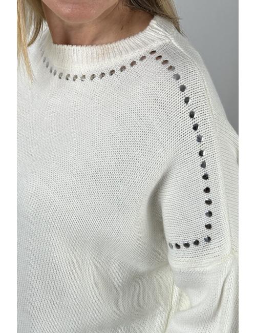 Oversized knitted jumper with silver stud detailing on the neckline and half sleeves. Made from a stretchy knit fabric that stands out for its softness, durability, elasticity and ease of care. A soft and warm jumper, ideal for adding a fun and sophisticated touch to your looks with trousers and skirts, both for everyday wear and weekends.