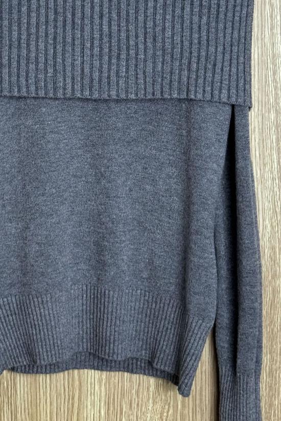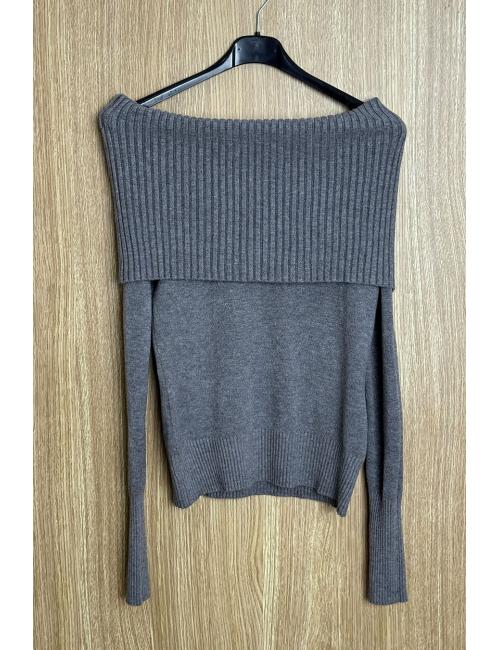 Smooth stretch knit jumper. Ribbed detailing on cuffs and collar. Bardot-style roll neck.