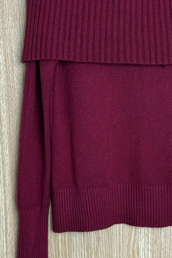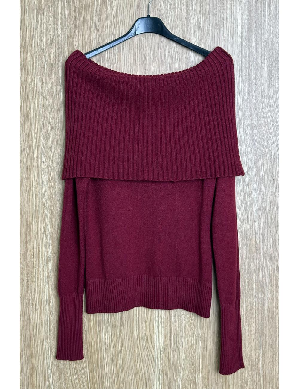Smooth stretch knit jumper. Ribbed detailing on cuffs and collar. Bardot-style roll neck.