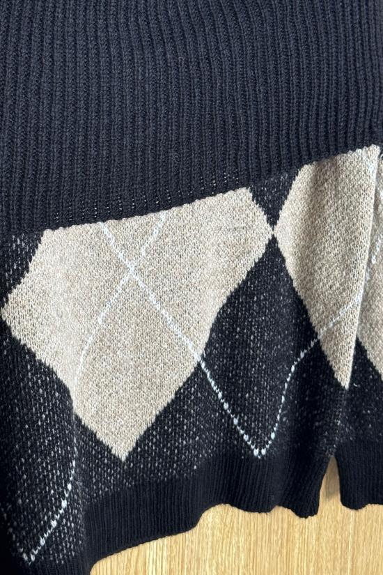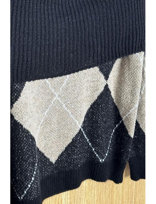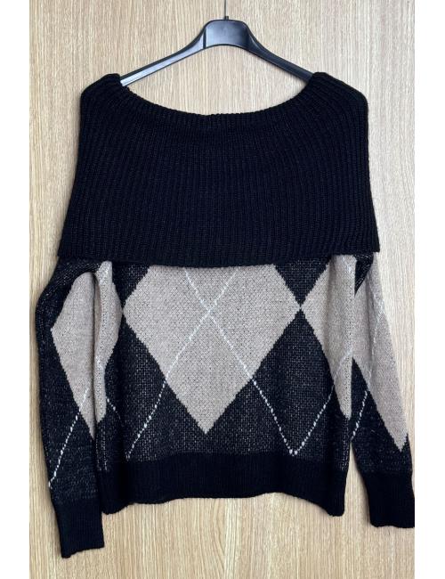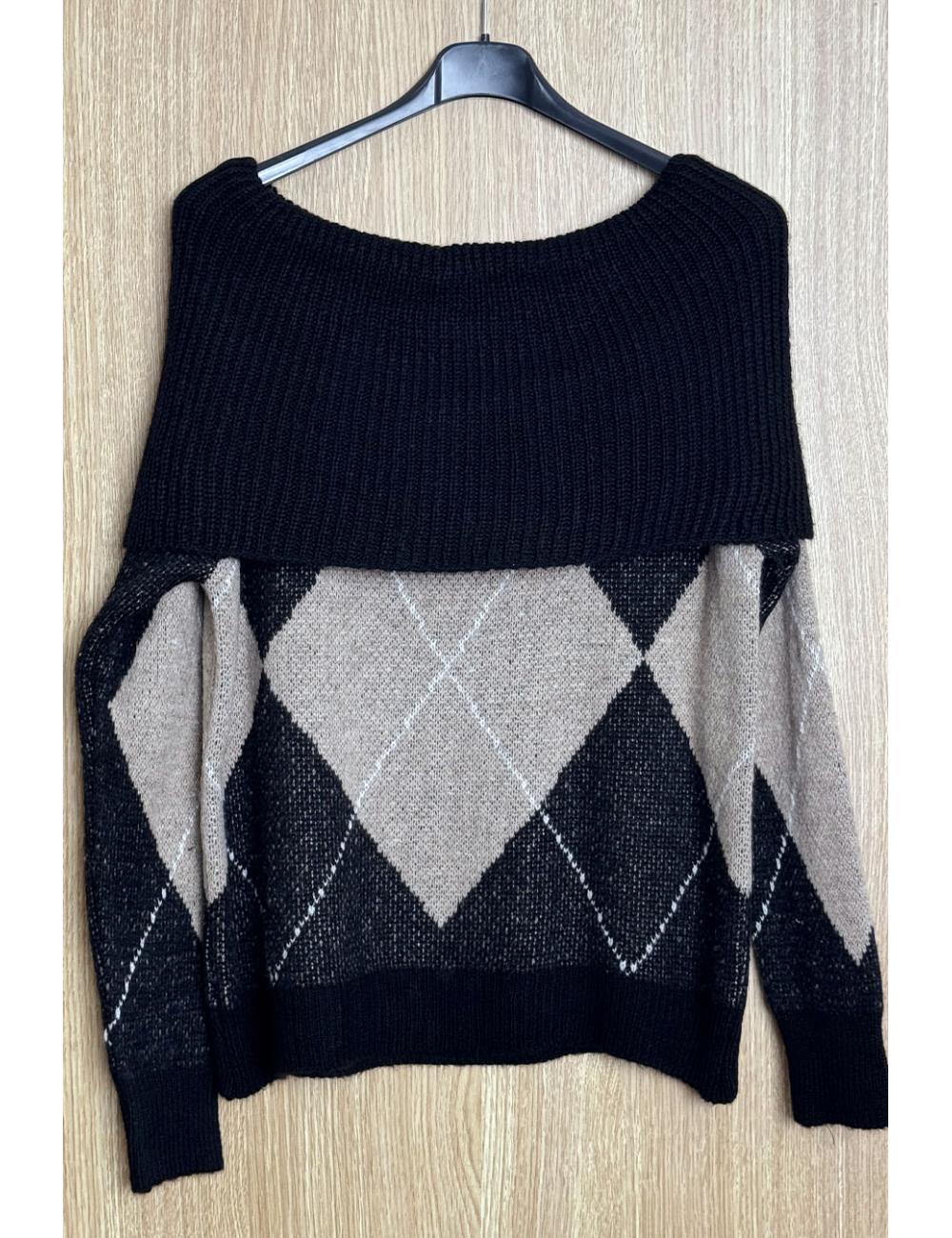 Fine wool jumper with diamond print. Bardot-style roll neck.