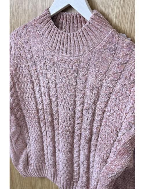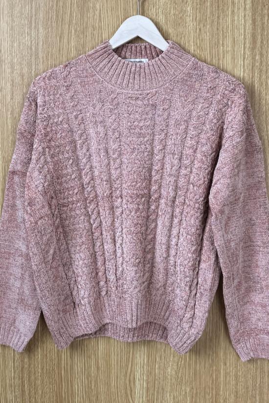 Thick, stretchy chenille knit jumper. Vertical braided weave with small multicoloured details. Round Perkins neck and ribbed cuffs.