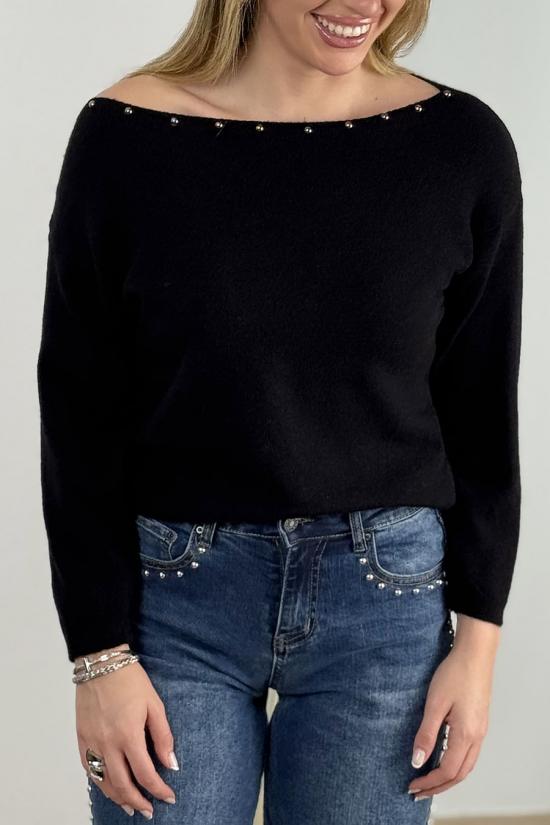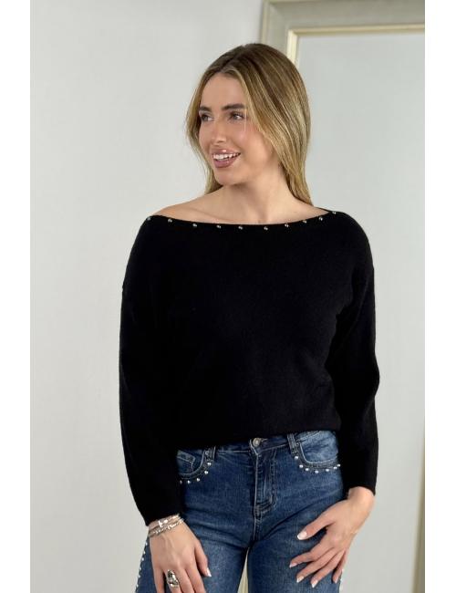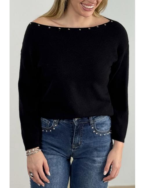 Fine stretch wool jumper with silver stud detailing on the semi-boat neckline. A comfortable and stylish jumper, ideal for adding a sophisticated touch to your casual looks and also for special occasions.