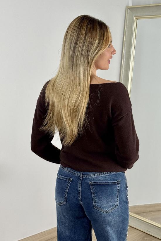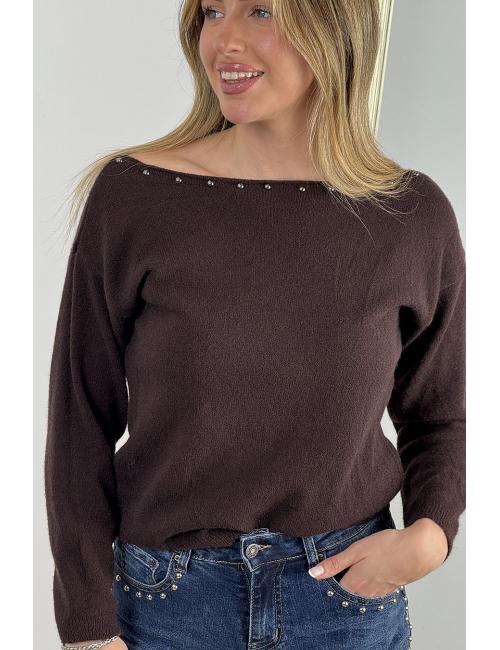 Fine stretch wool jumper with silver stud detailing on the semi-boat neckline. A comfortable and stylish jumper, ideal for adding a sophisticated touch to your casual looks and also for special occasions.