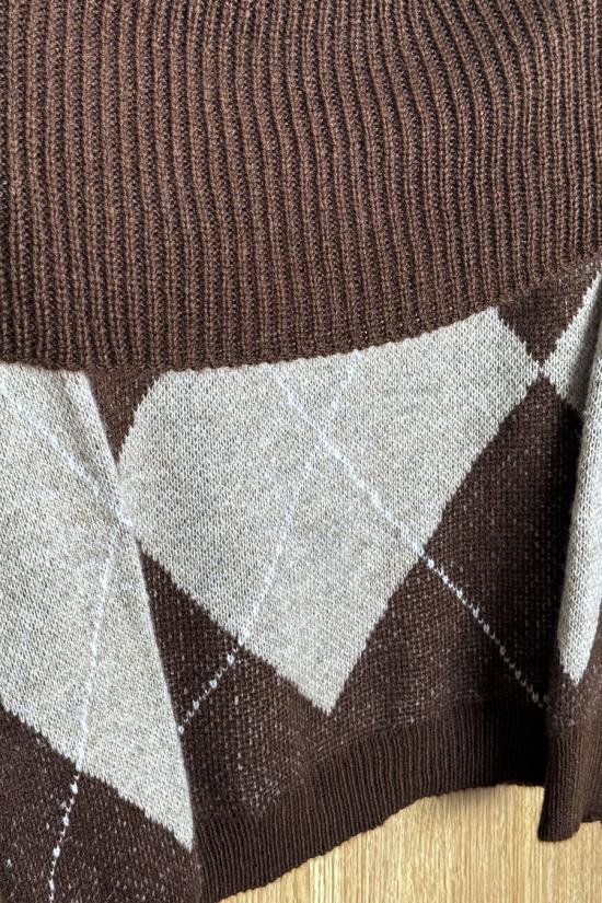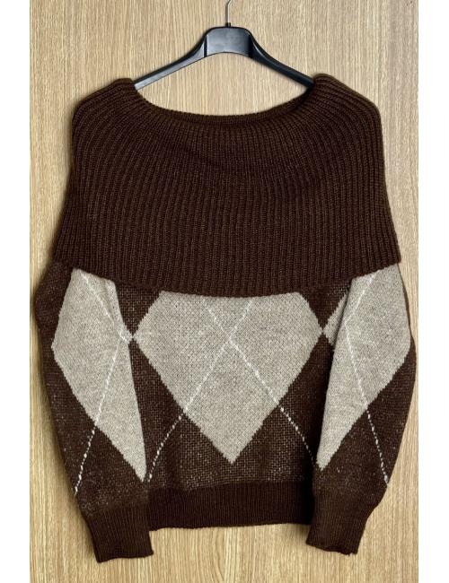 Fine wool jumper with diamond print. Bardot-style roll neck.