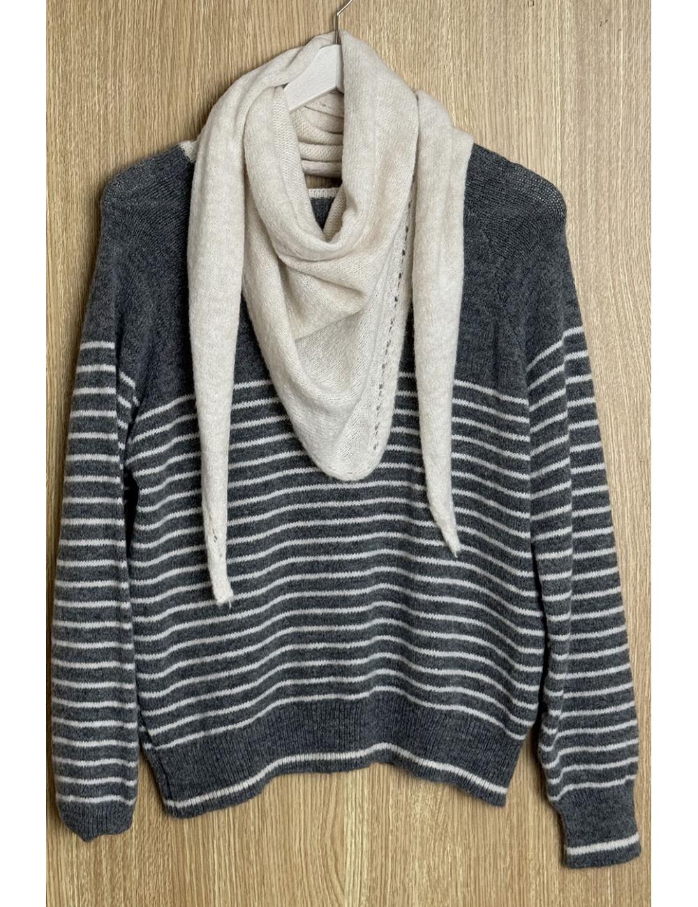 Two-tone jumper, half plain and half printed with contrasting thin horizontal stripes, including a scarf in the same fabric. Relaxed fit and round neck. Ribbed detail on cuffs and neck. Made from fine knit with a soft texture. A stylish and versatile jumper for your autumn-winter outfits.