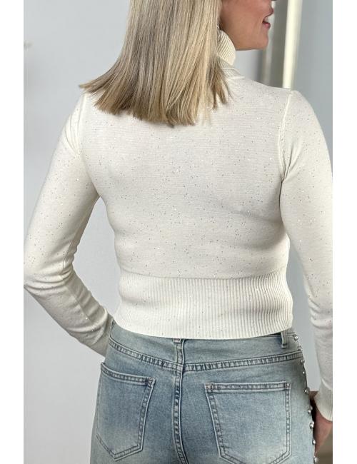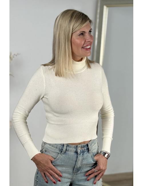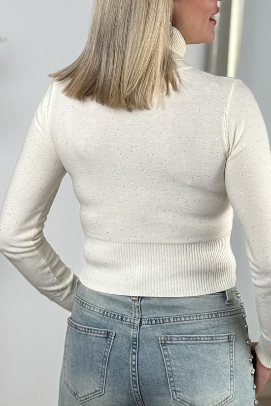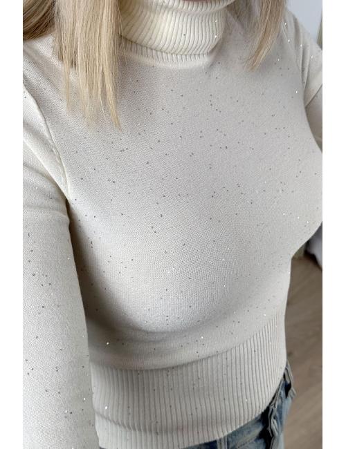 Plain high-neck jumper made from fine stretch wool. Small sequins scattered throughout the garment. Ribbed finish on the neck, cuffs and waist.