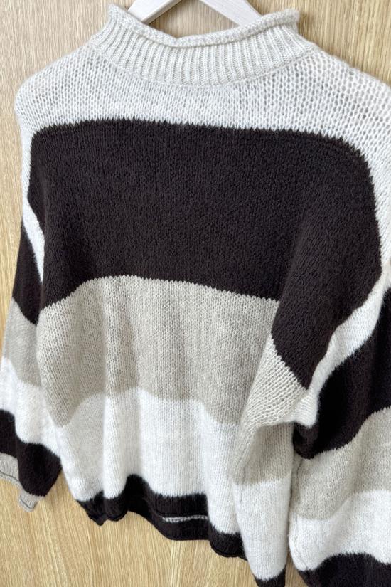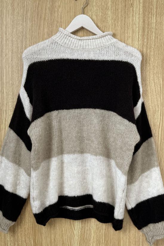 Three-colour jumper with contrasting wide horizontal stripes. Oversized fit and crew neck. Ribbed detailing on the cuffs and neck. Made from soft textured wool. A warm and comfortable jumper, ideal for your most relaxed autumn-winter outfits.
