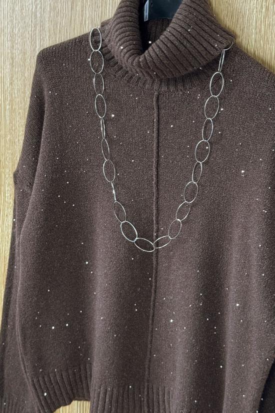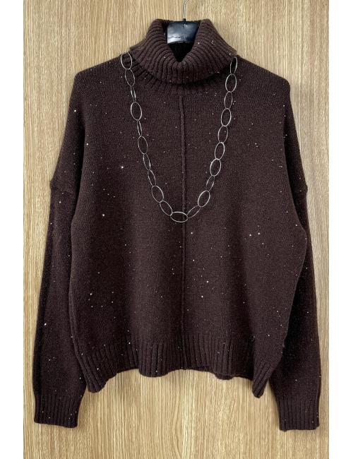 Long-sleeved jumper with a high neck and mini sequins scattered throughout. Decorative vertical stitching detail in the middle of the jumper. Made from fine-gauge plain knit fabric. A unique jumper for your festive outfits.