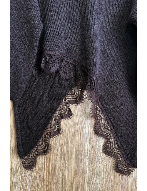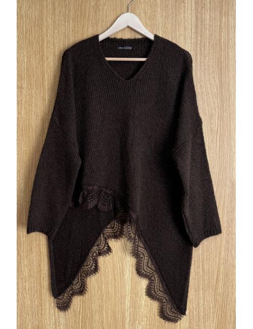 Oversized sweater with a long sleeve, V-neck, and asymmetrical lace hem. Made from soft, medium-weight wool. An original sweater inspired by the classic poncho with a unique and original twist.