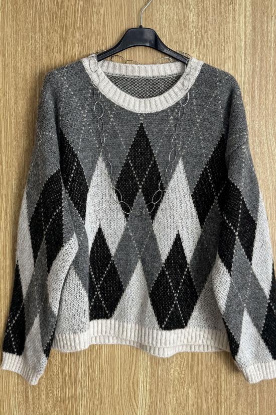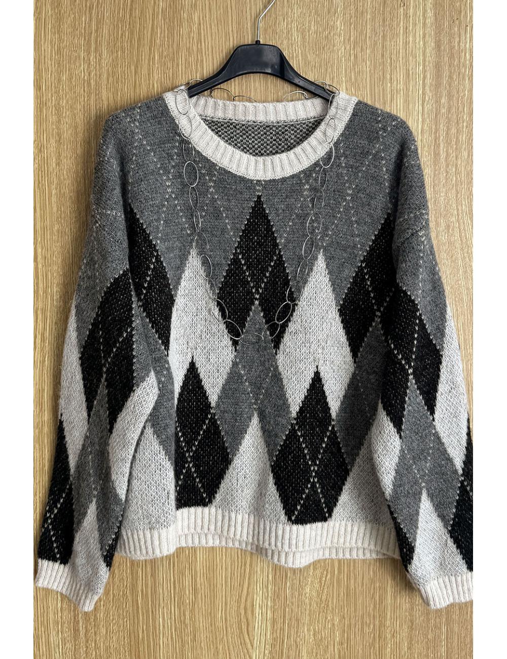 Relaxed fit sweater with a diamond pattern in three shades. Round neck, ribbed hem and cuffs. A timeless wardrobe staple made from extra-soft, medium-weight wool.