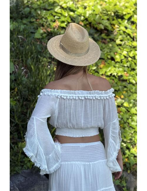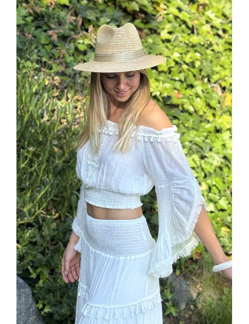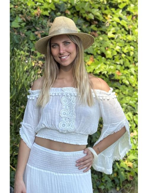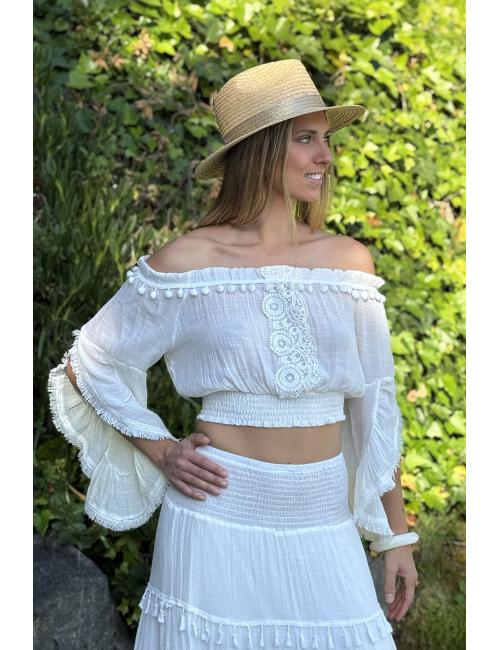 Ibizan-inspired short blouse with central guipure stripe with 3 flowers. Bardot neckline with elasticated waist with tassels. Waistband with honeycomb elastic. Asymmetrical flared three-quarter length sleeves finished with fringes.