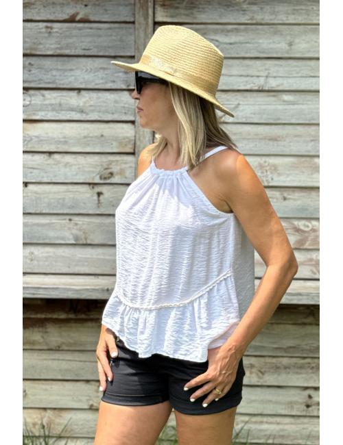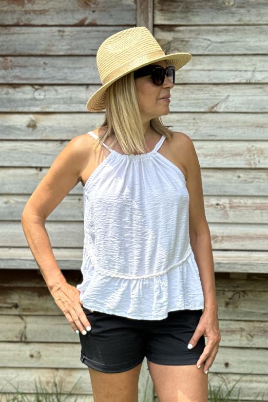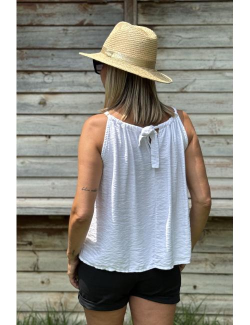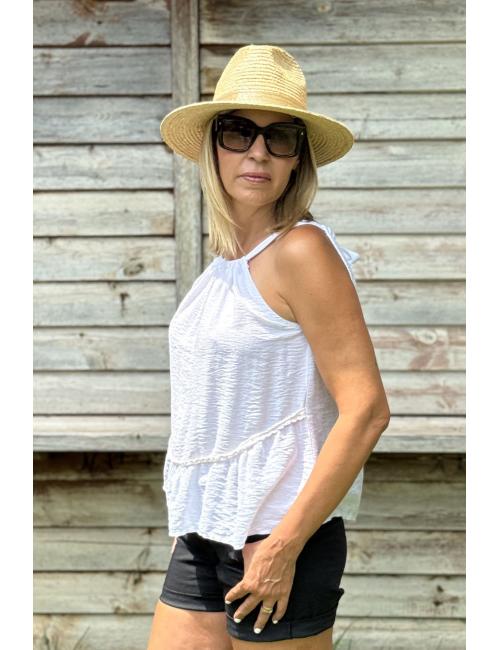 Bohemian sleeveless blouse made of cotton crepe, smooth and very comfortable to wear. Flowing and with decorative piping at the bottom and flounce at the hem. Round neck tied with straps and bow at the back. A wardrobe staple blouse with Ibiza inspiration and boho chic style, ideal for the summer season.