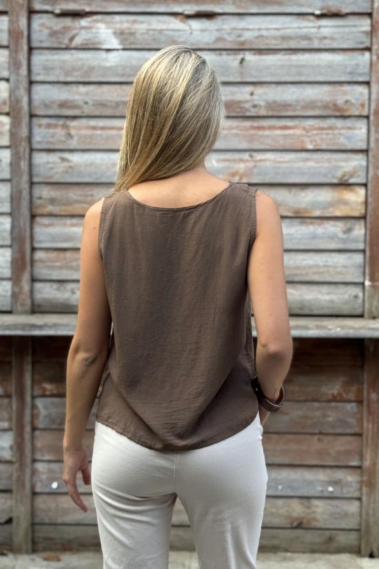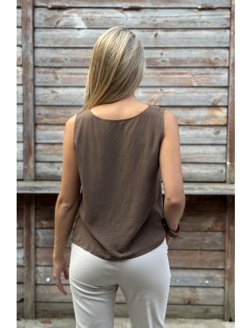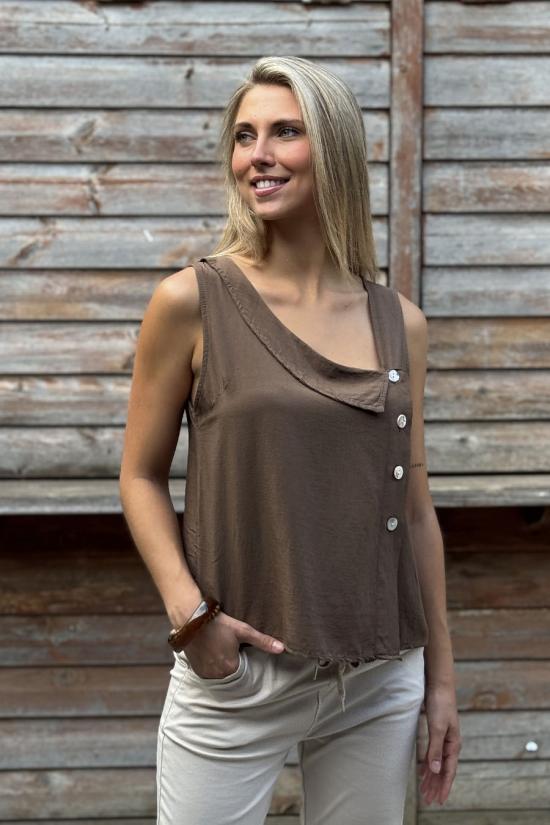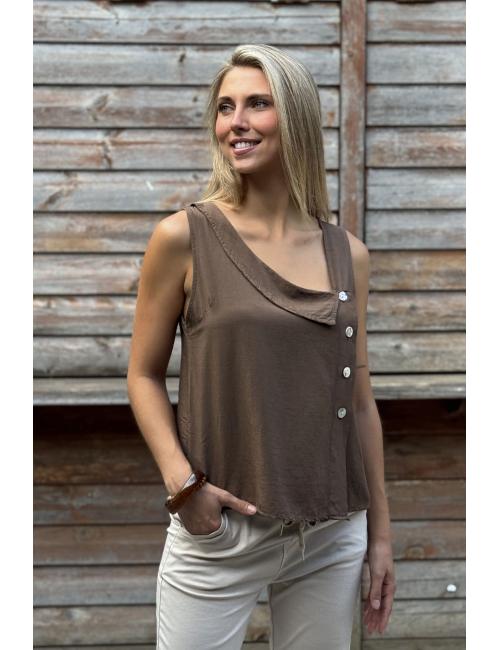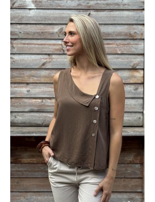 Bohemian sleeveless blouse made in cotton crepe, smooth and flowing. Asymmetric shirt collar and closing with 4 pearly buttons on one side.