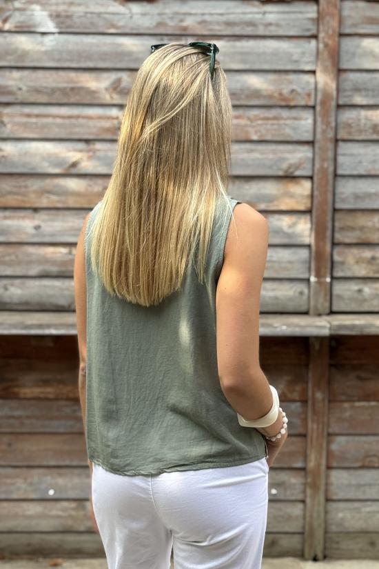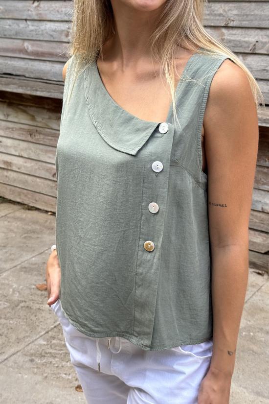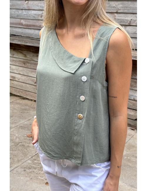 Bohemian sleeveless blouse made in cotton crepe, smooth and flowing. Asymmetric shirt collar and closing with 4 pearly buttons on one side.