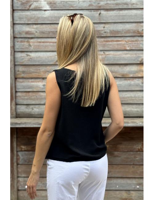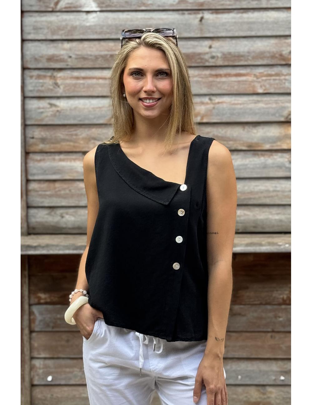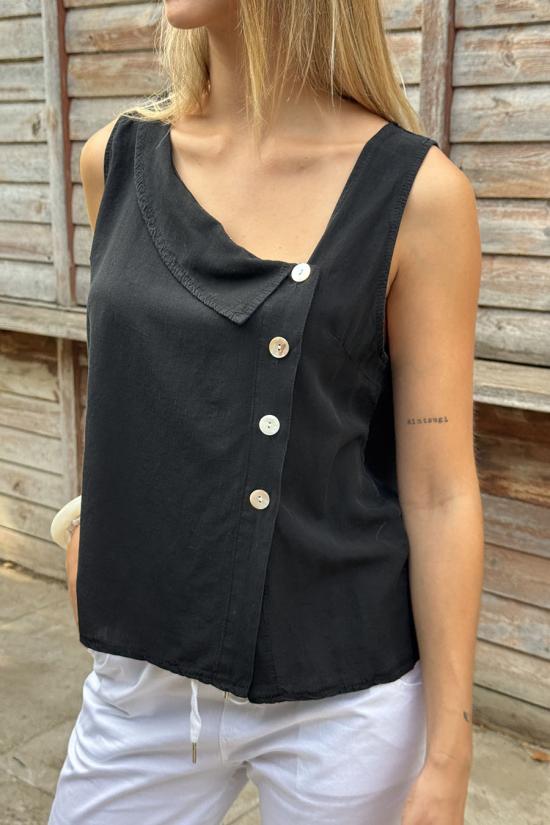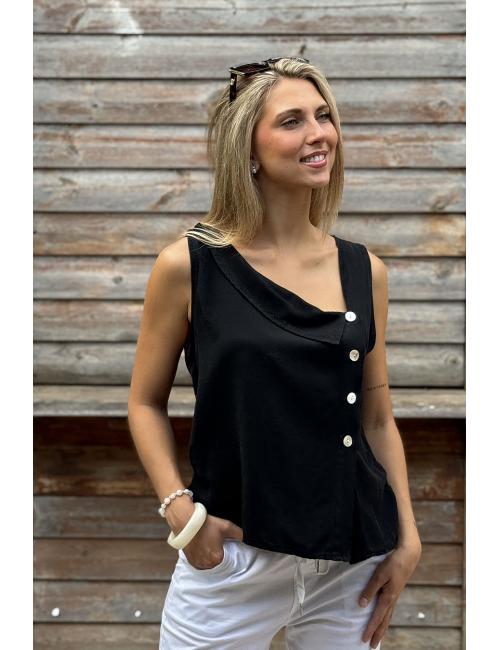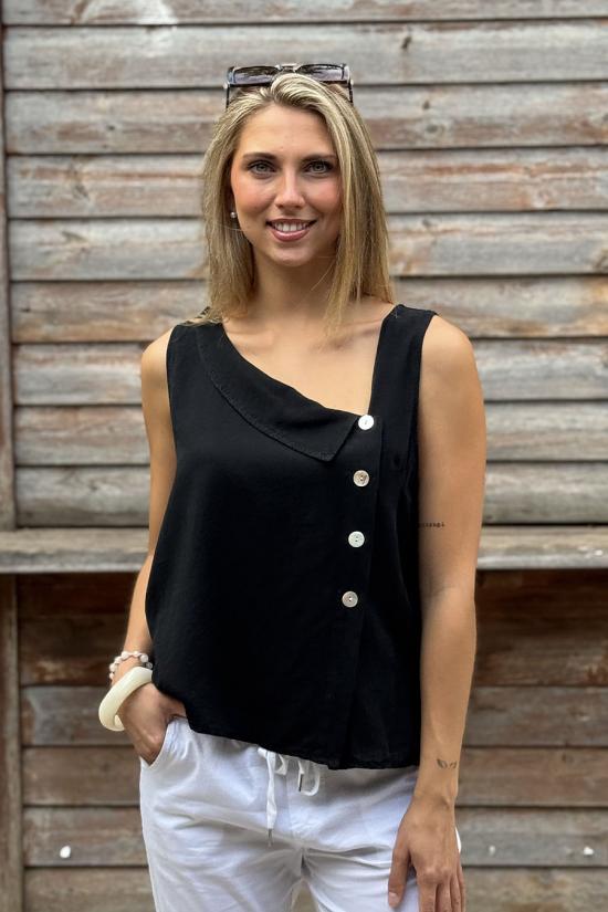 Bohemian sleeveless blouse made in cotton crepe, smooth and flowing. Asymmetric shirt collar and closing with 4 pearly buttons on one side.