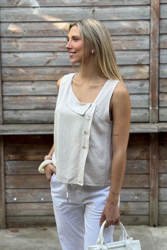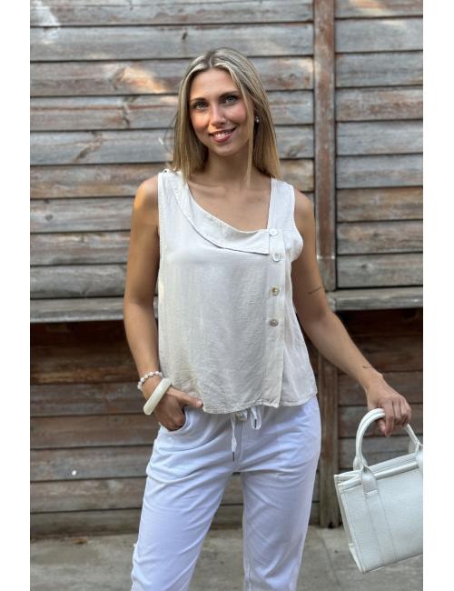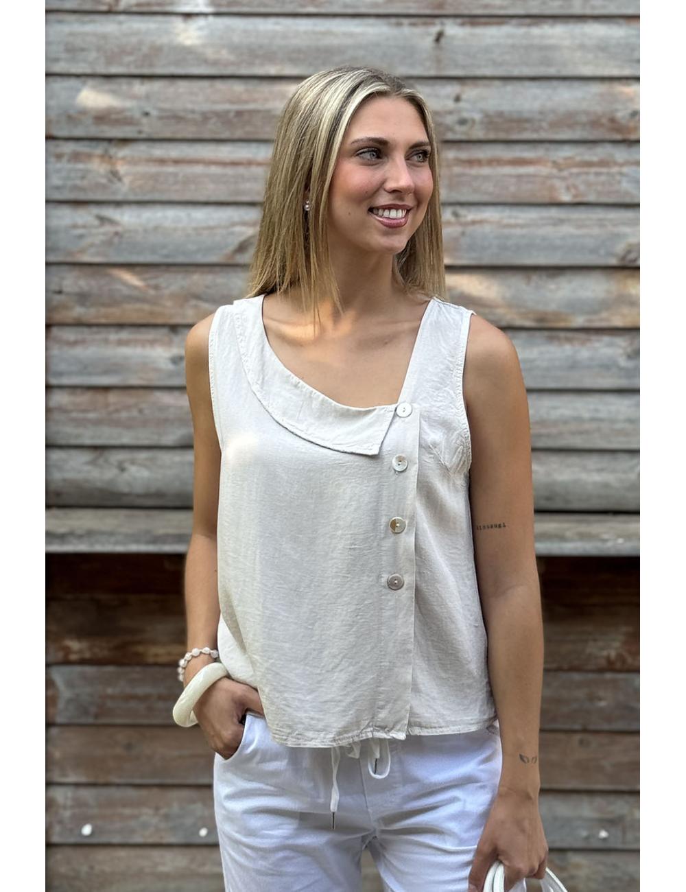 Bohemian sleeveless blouse made in cotton crepe, smooth and flowing. Asymmetric shirt collar and closing with 4 pearly buttons on one side.