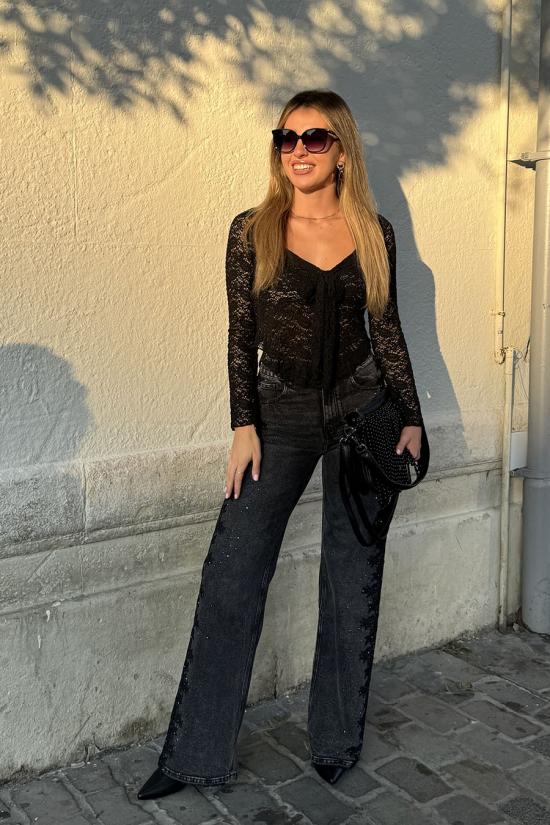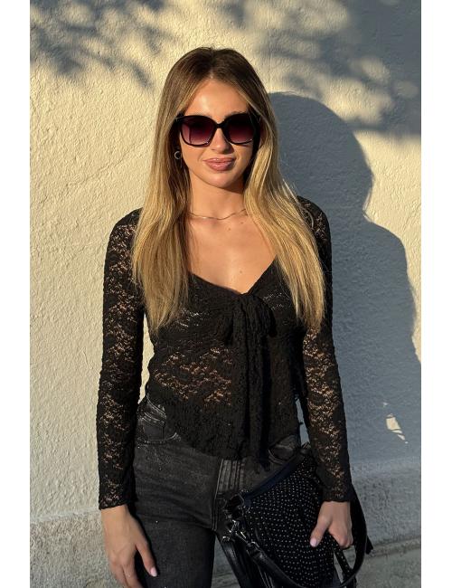 Long sleeve top in elasticated lace. V-neck. The sleeves and the bottom are semi-transparent. The chest is lined so that it is not transparent. Give a different, elegant and daring touch to your outfit with this super combinable top.