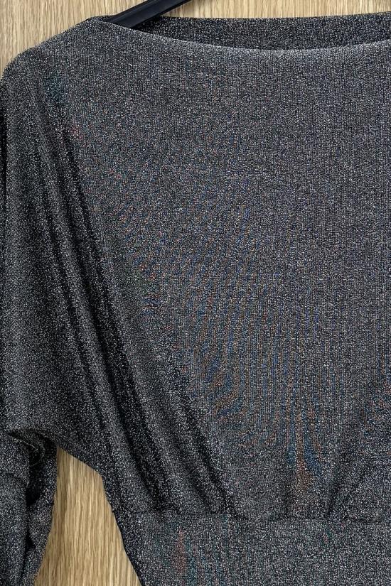 Cropped blouse made from shiny stretch lurex fabric. Semi-boat neck, long batwing sleeves and elasticated waistband.