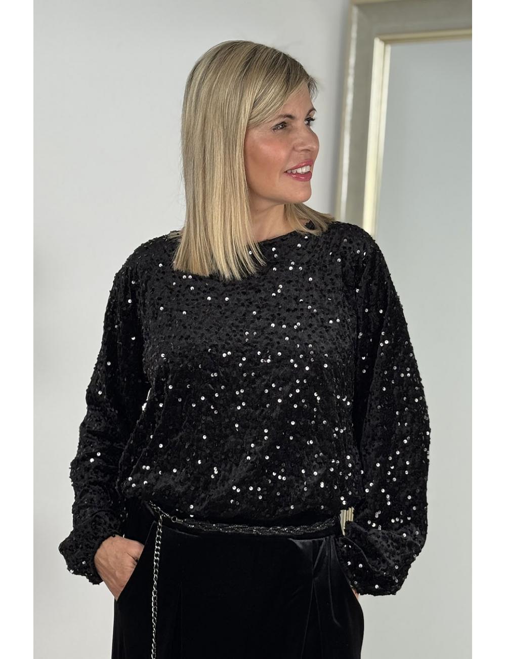 Short-sleeved blouse made from velvet fabric lined with sequins. Semi-boat neck and puff sleeves.