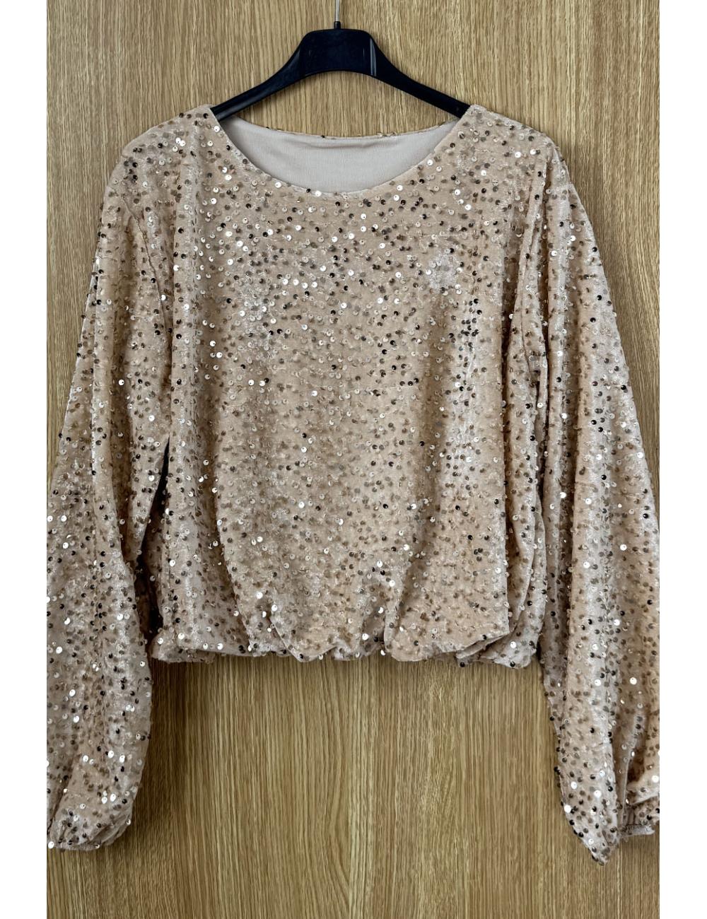 Short-sleeved blouse made from velvet fabric lined with sequins. Semi-boat neck and puff sleeves.