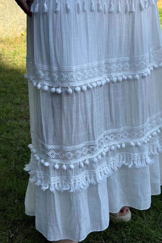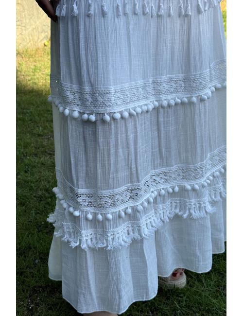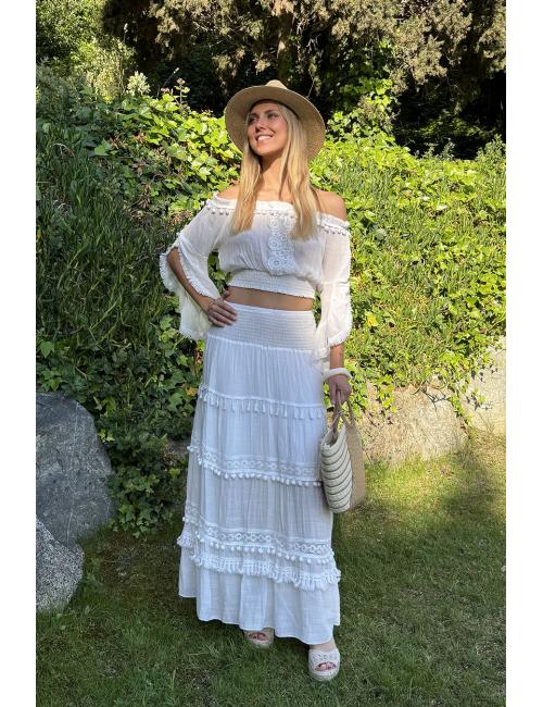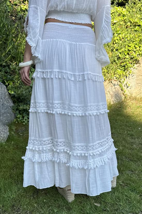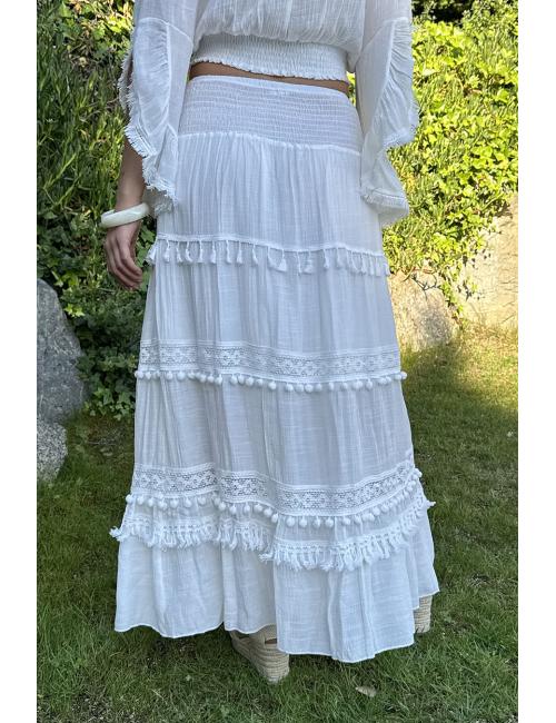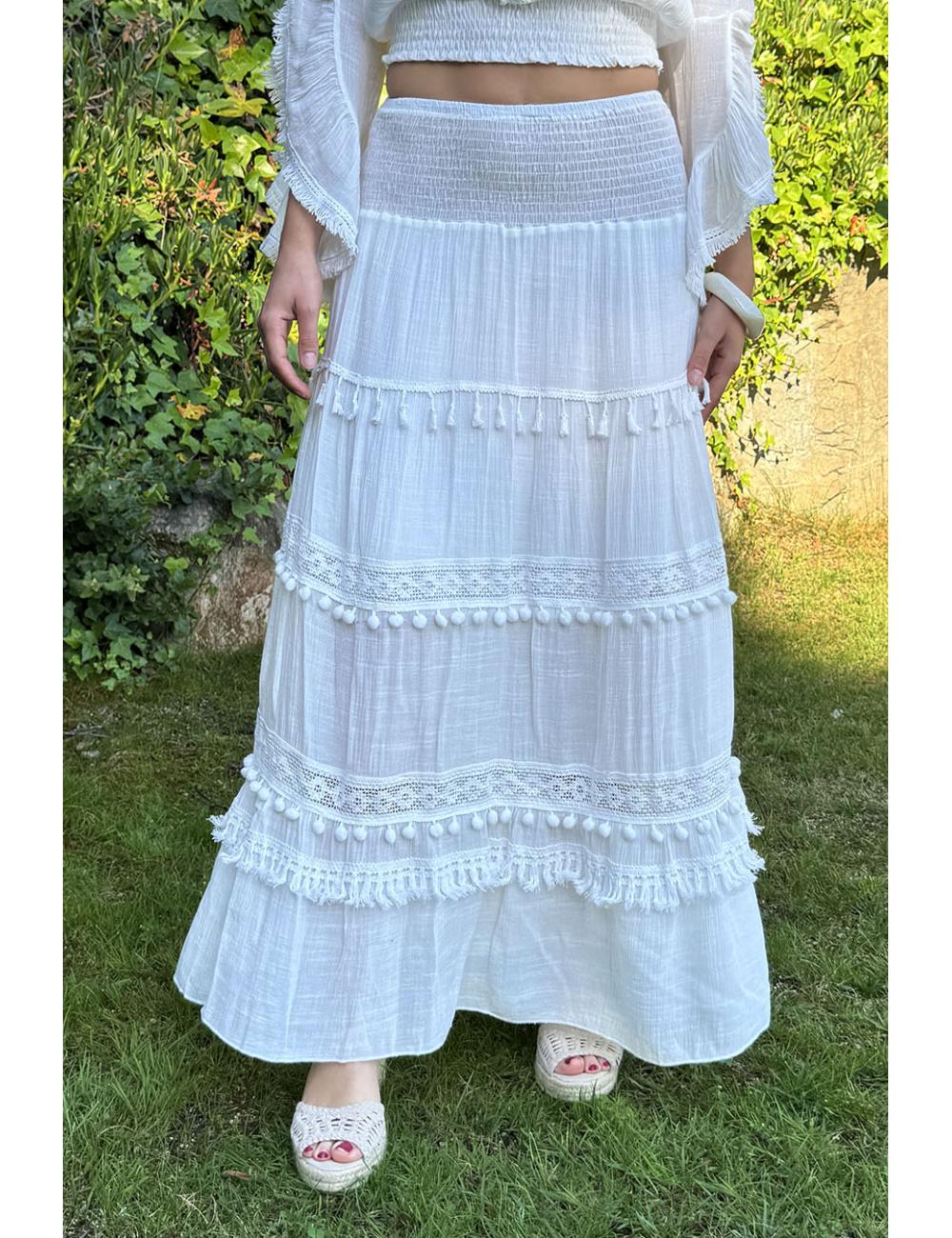 Ibizan long skirt, it has guipure lines and ruffles with tassels. It includes a wide honeycomb elastic at the waist that makes it adaptable to several sizes.