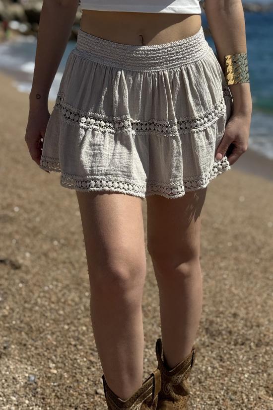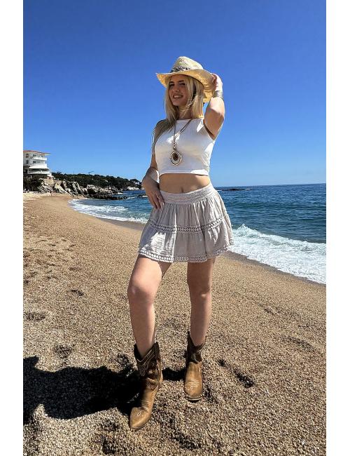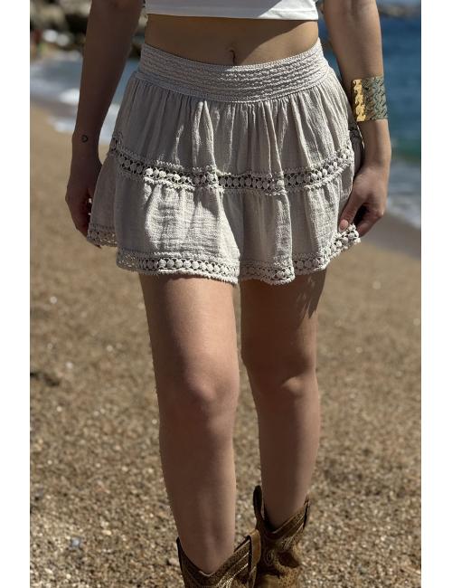 Mini skirt with bámbula fabric ruffles and guipure details. High waisted and wide elasticated waist for a better fit.