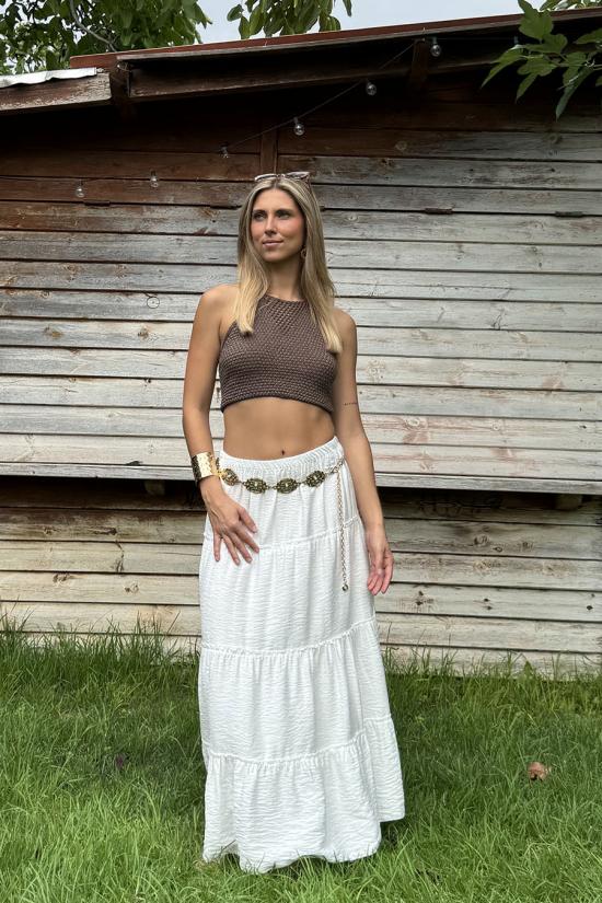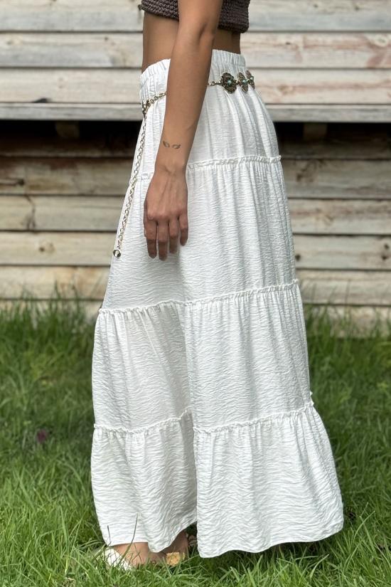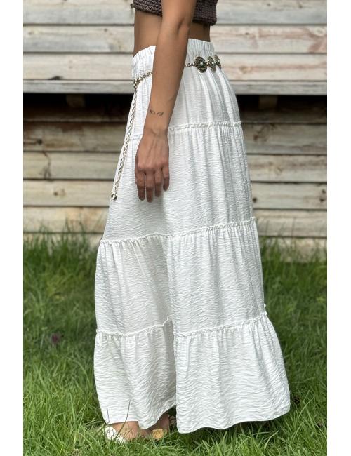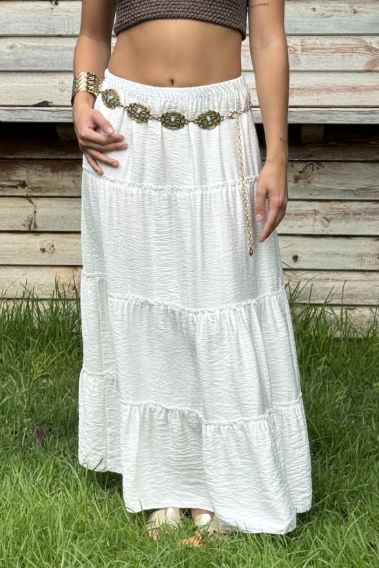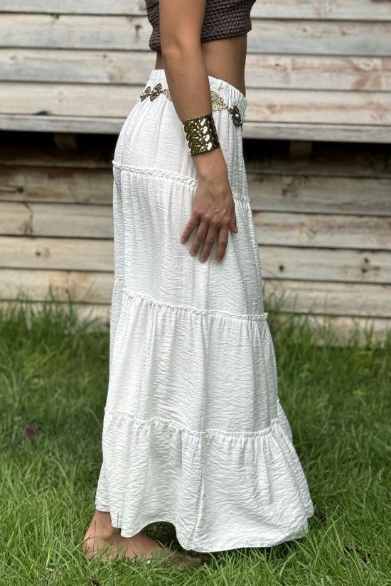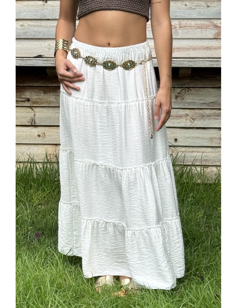 Long flowing ibicencan skirt with three horizontal seams. It includes an elastic waistband that makes it adaptable to several sizes.