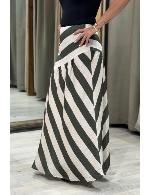 Long, flowing flared skirt. Printed with wide diagonal stripes. Elasticated waistband that adapts to different sizes. A stylish, cool, unique and fun skirt, perfect for your summer and mid-season looks.