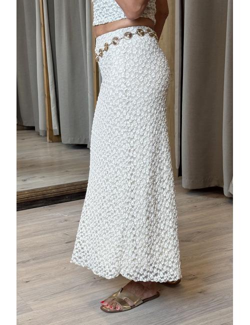 Long flared maxi skirt. Made from embroidered tulle. Elasticated waistband to fit a range of sizes.