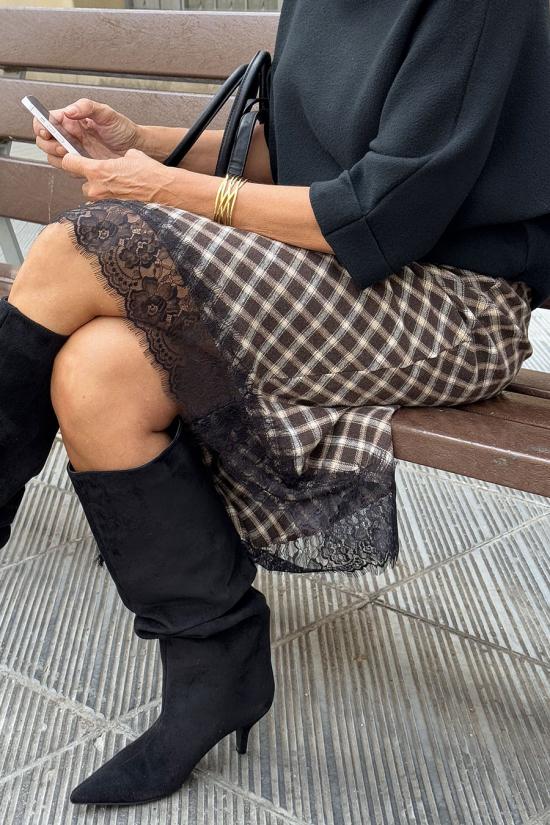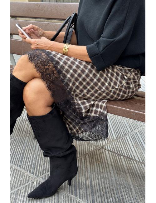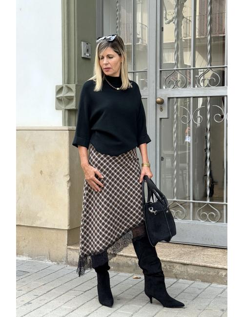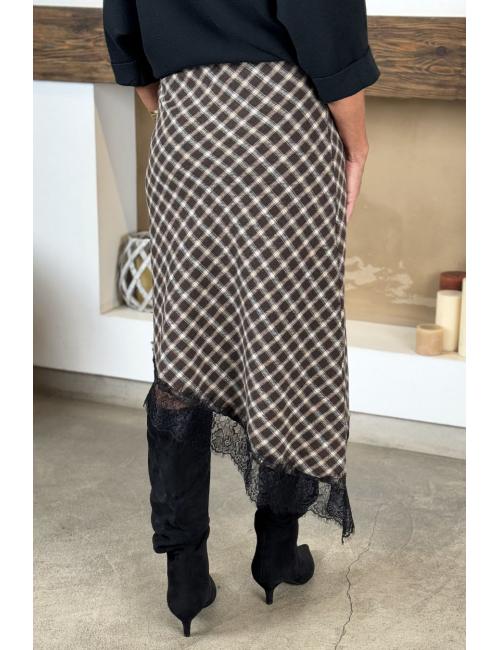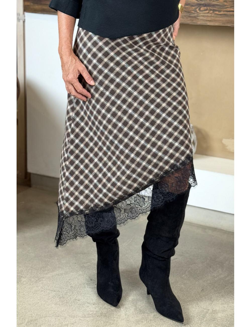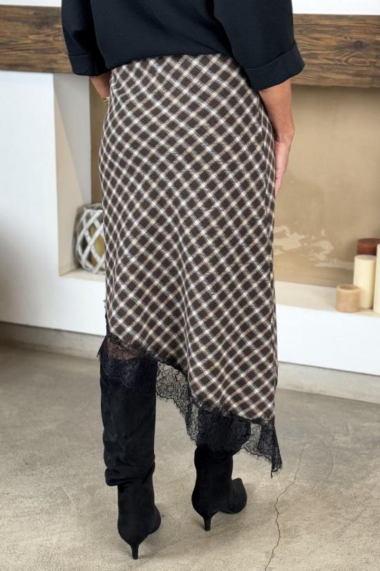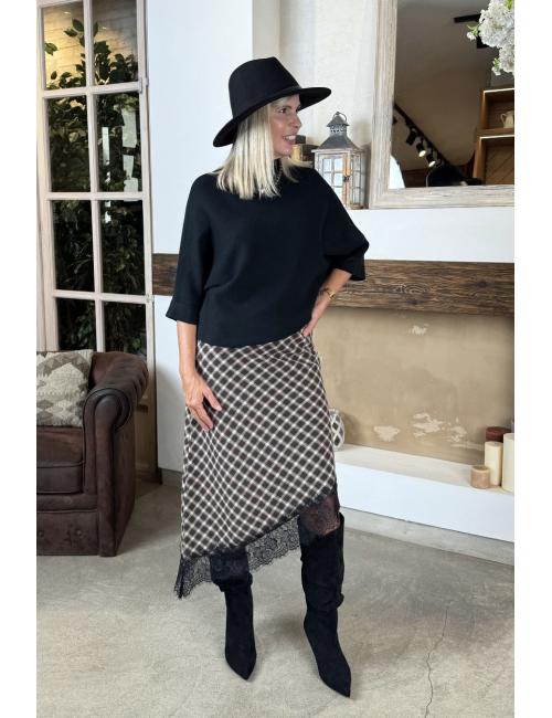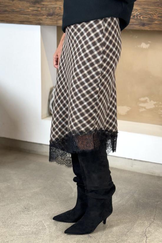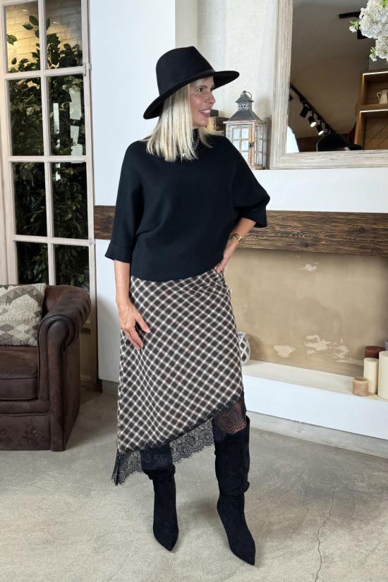 Long skirt with small diamond print. Made from fleece with an asymmetrical hem finished with black lace trim. Mid-rise and invisible elastic waistband. A traditional yet updated design, versatile and adaptable to your everyday and weekend looks.