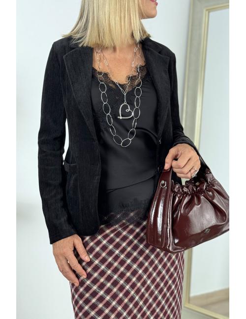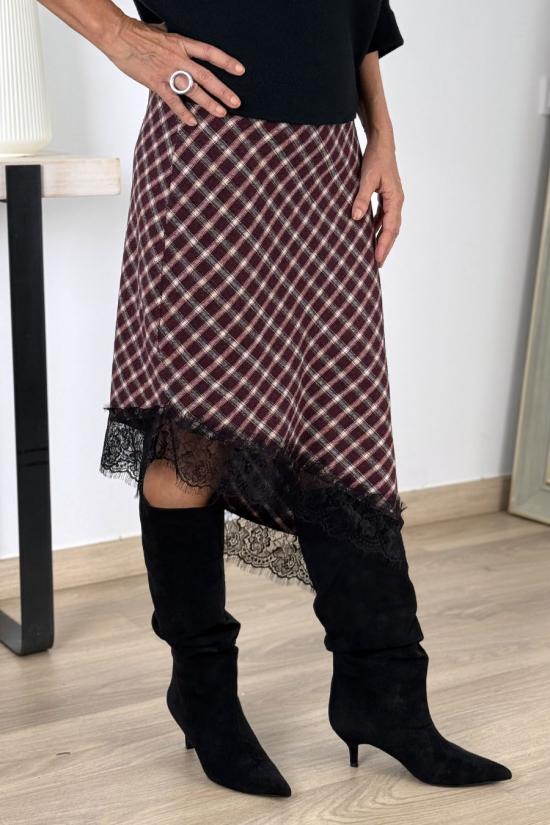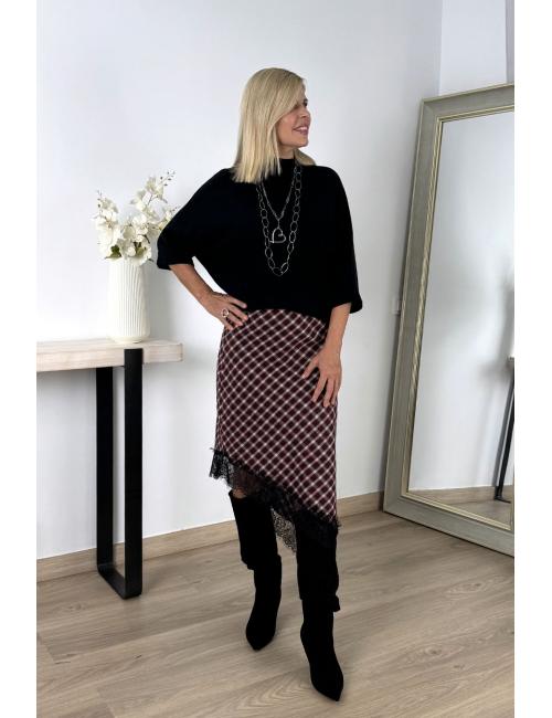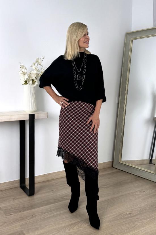 Long skirt with small diamond print. Made from fleece with an asymmetrical hem finished with black lace trim. Mid-rise and invisible elastic waistband. A traditional yet updated design, versatile and adaptable to your everyday and weekend looks.
