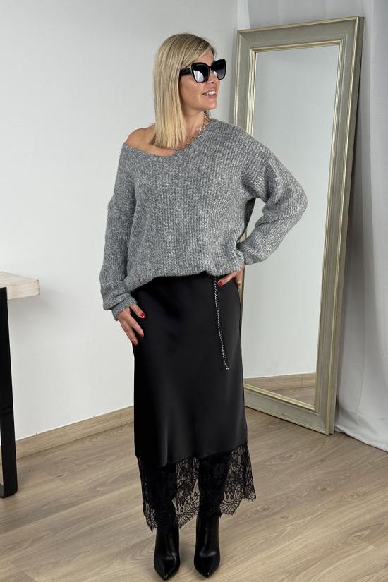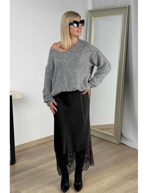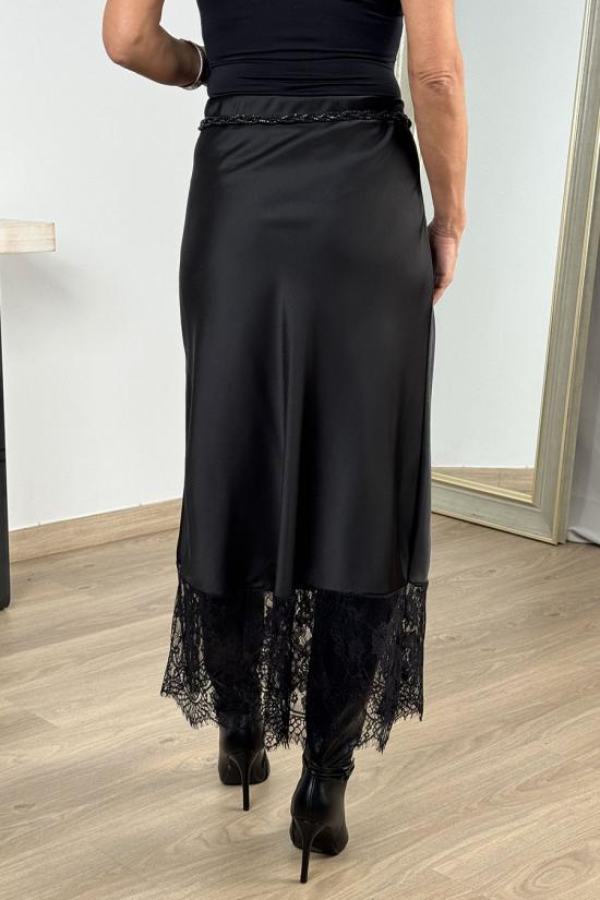 Long satin skirt with lace detail on the hem. Invisible elastic waistband makes it adjustable from size 36 to 42.