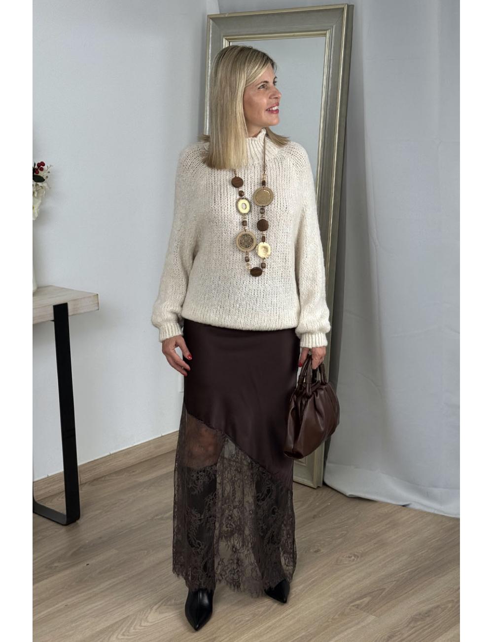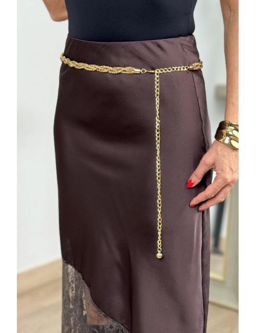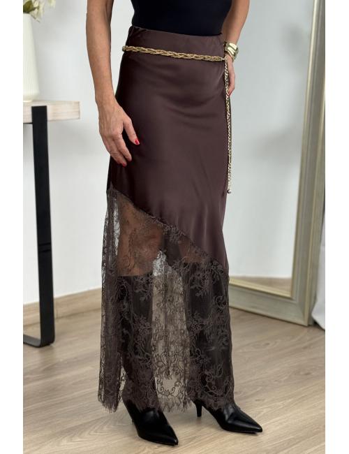 Midi slip skirt made from satin and lace. Diagonal cut between the two fabrics. Elasticated waistband for a versatile fit.