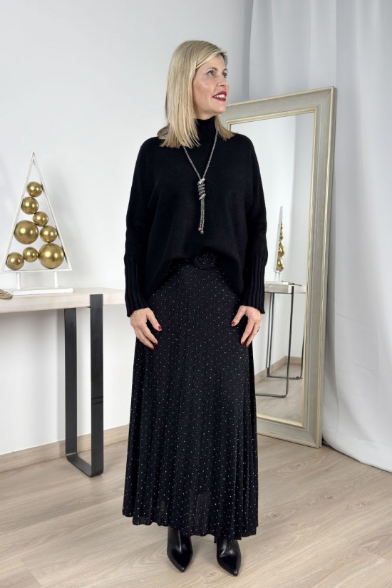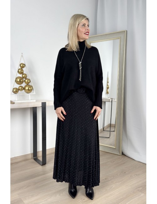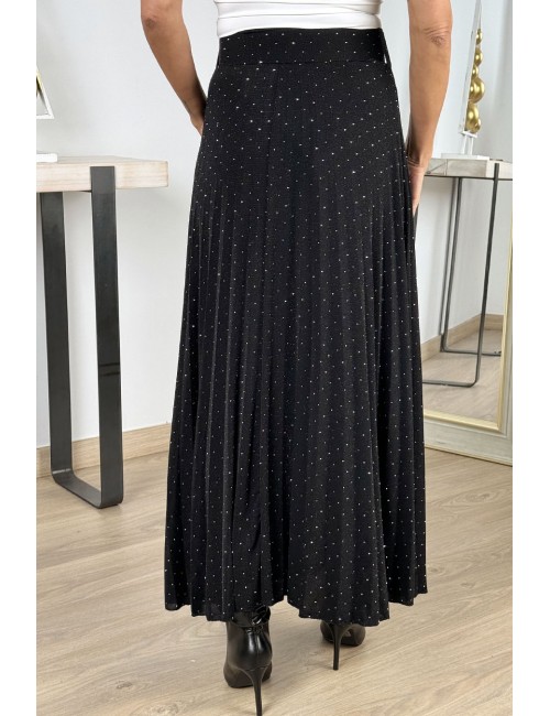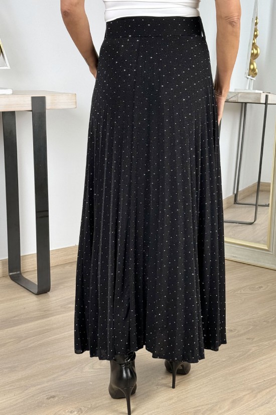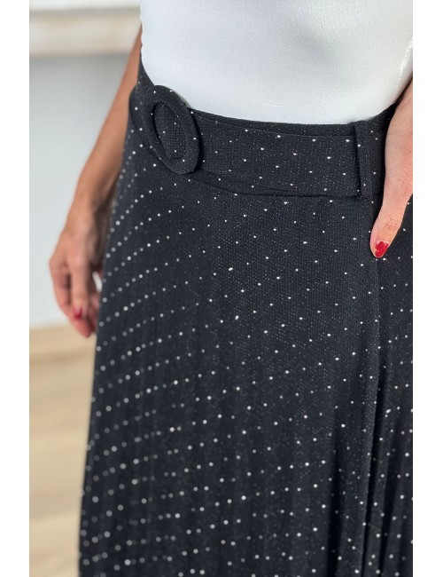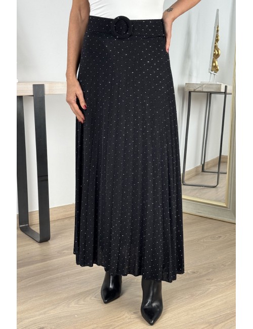 Pleated maxi skirt made from stretch lurex fabric with rhinestone details scattered throughout. Elastic waistband and matching textile belt with a round buckle.