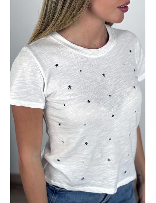 Short-sleeved T-shirt made of elasticated cotton jersey. Detail of round and star-shaped studs on the front. Round neck.
