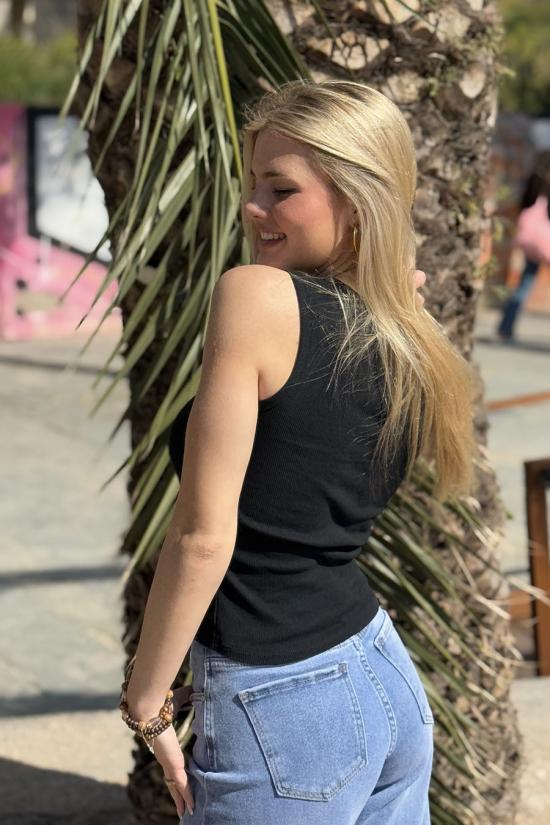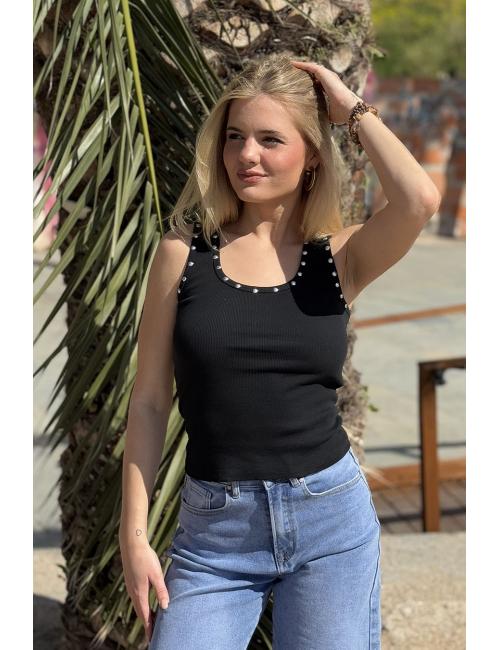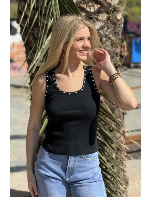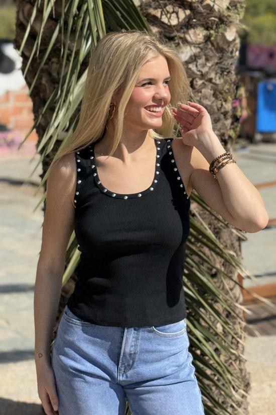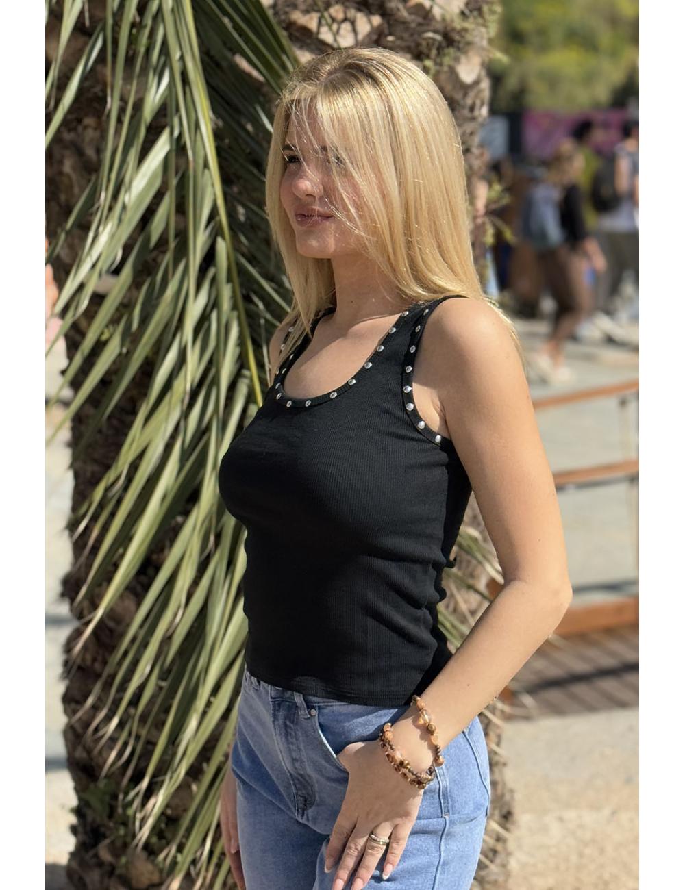Sleeveless swimmer style T-shirt with silver studs detail on neckline and armholes. Made in elastic ribbed knit. A basic with a different touch.