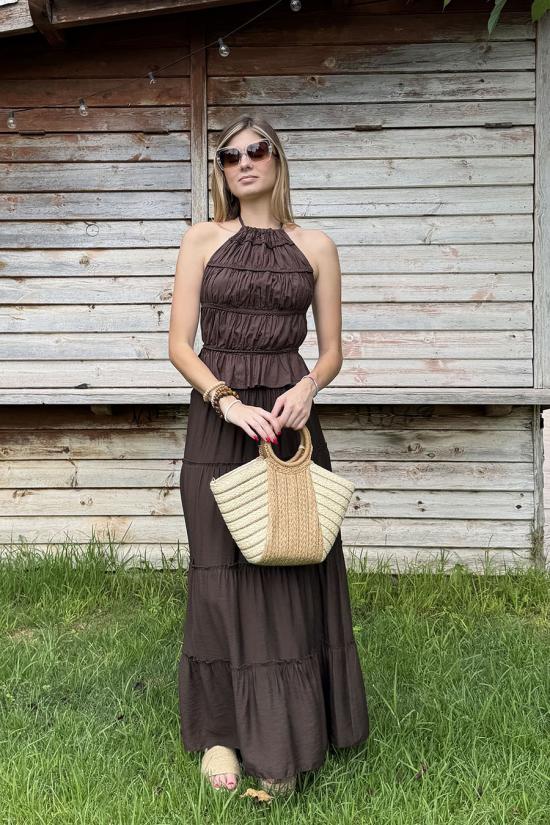 Top with ruffles in boho style. Halter neck which is tied at the back with two thin straps. Including adjustable horizontal straps at the back.